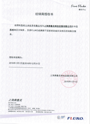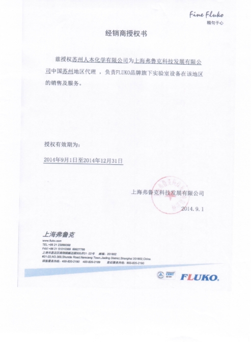 2014.9.1苏州人本化学有限公司获得上海弗鲁克科技发展有限公司在中国苏州地区的代理权。